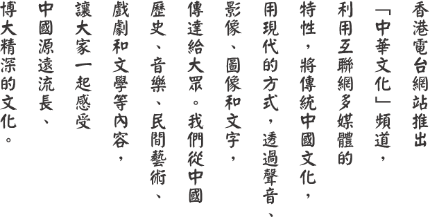網頁設計以朝代劃分,每個朝代,我們都會提供重要歷史事件的文字簡介,再配以香港廣播史上最長壽的歷史教育節目—「中華五千年」。網友可根據朝代,重溫全數九百集的節目內容,認識由軒轅黃帝至中華人民共和國建國,前後長達五千年的歷史。該節目由魏便利和梁家永主持,用廣播劇形式,演繹精彩的歷史故事。