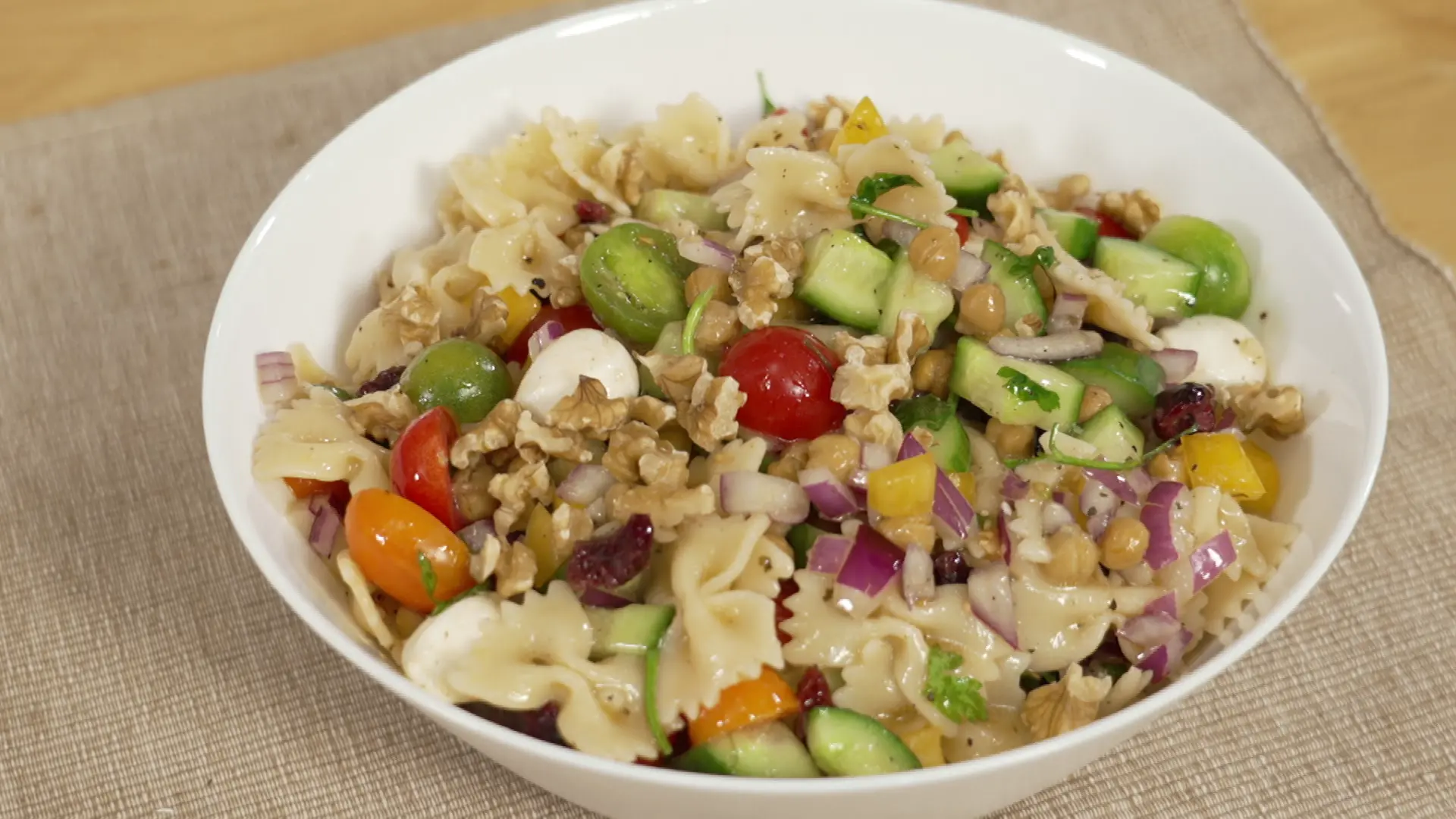 - 在大碗中混合所有蔬菜、芝士、放涼的蝴蝶粉及鷹嘴豆