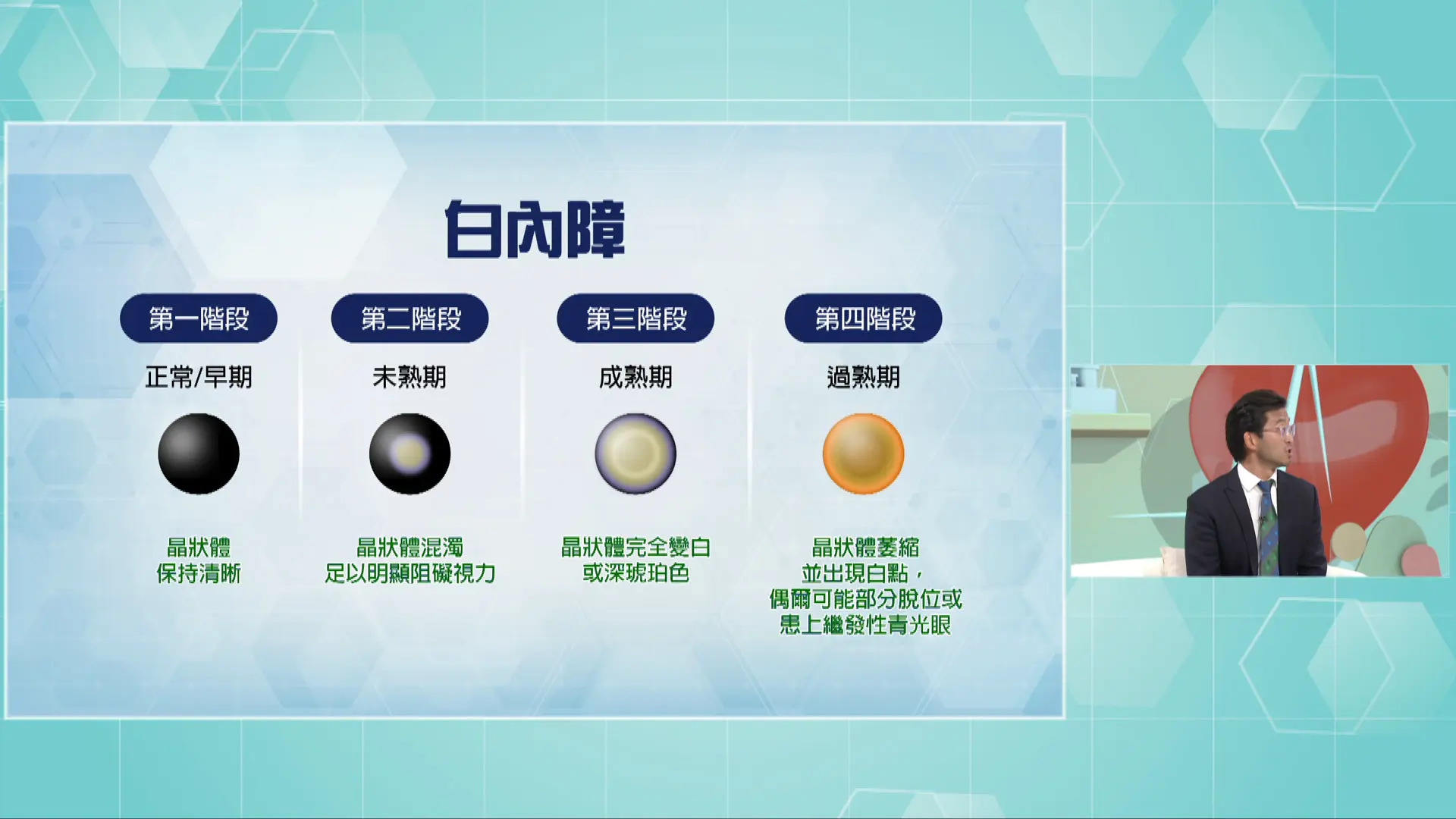 所謂「六成熟」指白內障的發展期約在第二、三階段之間,即是眼睛的晶體已明顯呈現白色,患者看東西會感到視線像被一層紗布遮蓋。但要注意:並非一定要等到六成熟才有需要動手術,而是應考慮它對日常生活的影響,例如一些較年輕的病人需要駕駛車輛,即使白內障只有一成也有可能影響工作安全,便有需要動手術。相反,70、80歲的老友記日常生活只有看電視、吃飯或逛公園,有七成視力已足以應付,不用急著動手術。