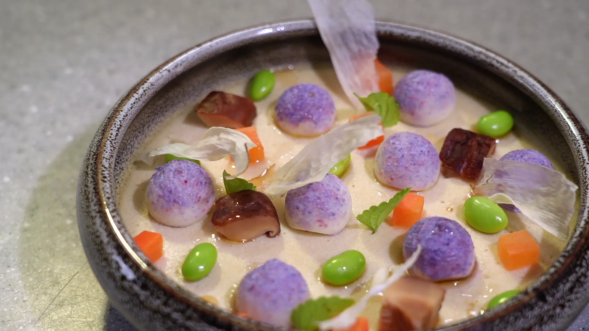 - 製作嫩滑豆腐糊:選用板豆腐而非滑豆腐,因為其水分含量較少,更容易控制成品的軟硬度。將板豆腐、切成小塊的鮮淮山、蔬菜湯和少許鹽放入攪拌機中打成幼滑糊狀。