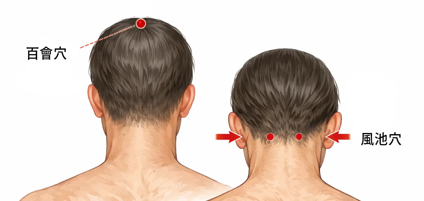 - 2. 風池穴(後頸部,枕骨下兩側凹陷處,與耳垂平齊):疏通膽經氣血,改善頭部供血,緩解頭皮緊張。