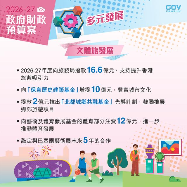 政府會向旅發局撥款16億6千萬元,提升旅遊吸引力。推出超過20年的「幻彩詠香江」會以全新表演取代。又建議撥款2億元推出先導計劃,鼓勵推展北都鄉郊旅遊項目。