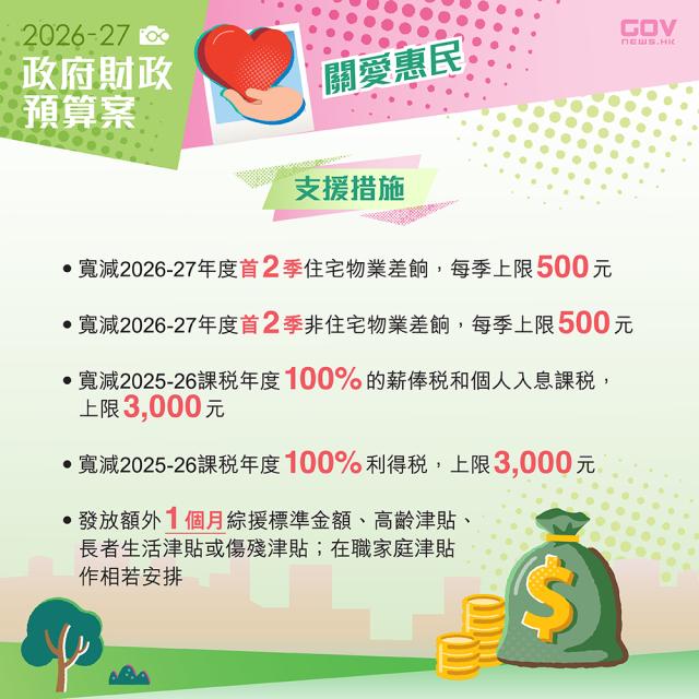 Financial Secretary Paul Chan delivered the 2026-27 Budget on Feb 25, themed "Driving High-quality, Inclusive Growth with Innovation and Finance". With finances returning to surplus, relief measures includes tax rebates for salaries and profits tax, rates concession, and increased allowances for children and dependent parents. Press ahead with the industrialisation of AI and AI Training for All, proactively aligning with the national "15th Five-Year Plan". Additionally, $150 billion from the Exchange Fund will support the Northern Metropolis & other infrastructure projects.