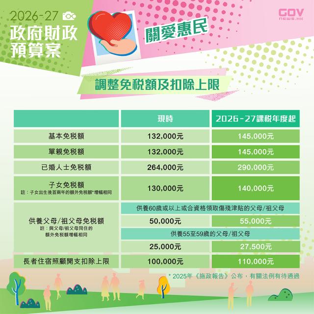 預算案提出,薪俸稅及利得稅退稅上限由去年的1500元,提高至3000元,寬減首兩季差餉,每戶上限500元。子女免稅額、供養父母及祖父母免稅額,都建議提升。