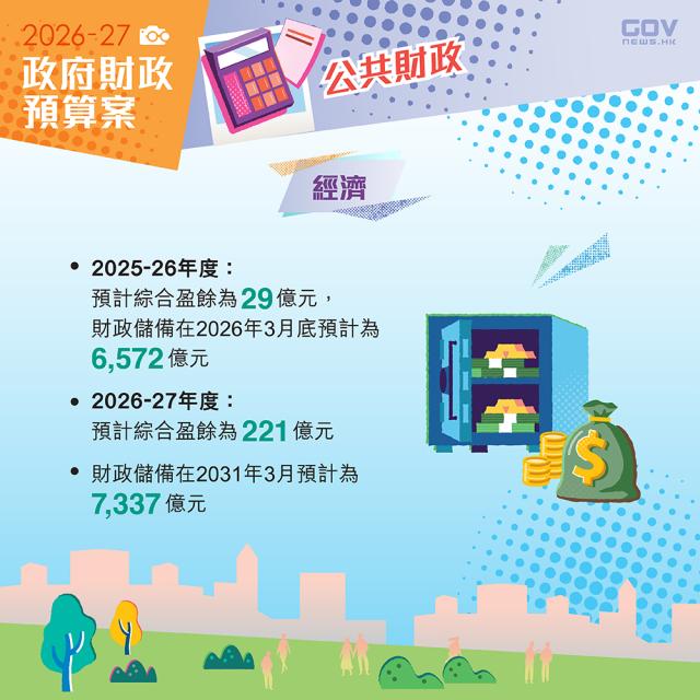 預計本年度綜合盈餘29億元,預測全年實質經濟增長2.5%至3.5%,整體通脹率1.8%。未來5年將發行每年1600億至2200億元債劵。中期而言,經營帳目將持續維持盈餘,預計財政儲備將逐步增至超過7000億元。