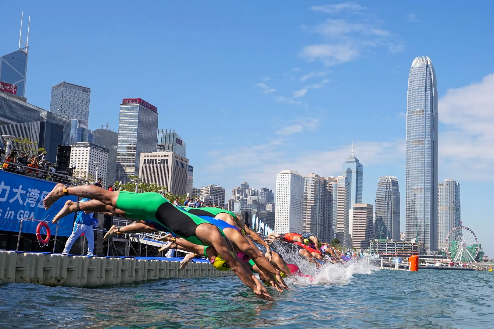 三項鐵人賽選手首先在維港游泳1.5公里(圖片來源﹕新華社)